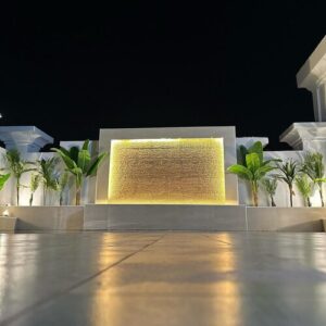 • دمج الإضاءة المناسبة حول الشلال والنباتات المحيطة به يضيف تأثيرًا بصريًا ساحرًا خاصة في المساء، ما يجعل الحديقة مكانًا مثاليًا للراحة والاستجمام، ويعزز من جاذبية المكان ويجعله أكثر أناقة وفخامة.