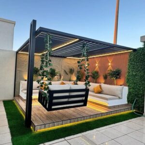 • الإضاءة المخفية بين النباتات والجلسات تضيف أجواء دافئة في المساء وتبرز جمال الحديقة بأسلوب راقٍ.