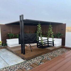• كما تستخدم الخامات العصرية مثل الخشب الصناعي والأحجار الخفيفة في تصميم الممرات والجلسات لإضافة لمسة فنية أنيقة.