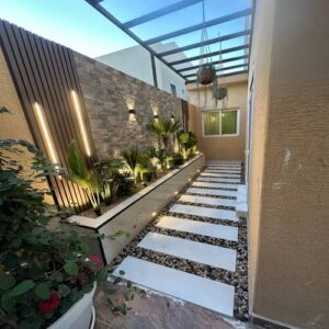 - كما يتم التركيز على تنسيق الألوان واستخدام العشب الصناعي أو الطبيعي لتغطية المساحات الصغيرة، بالإضافة إلى إنشاء ممرات حجرية ومناطق جلوس مريحة تتناغم مع باقي عناصر الحديقة، مما يمنح المكان طابعاً مميزاً من الرفاهية.